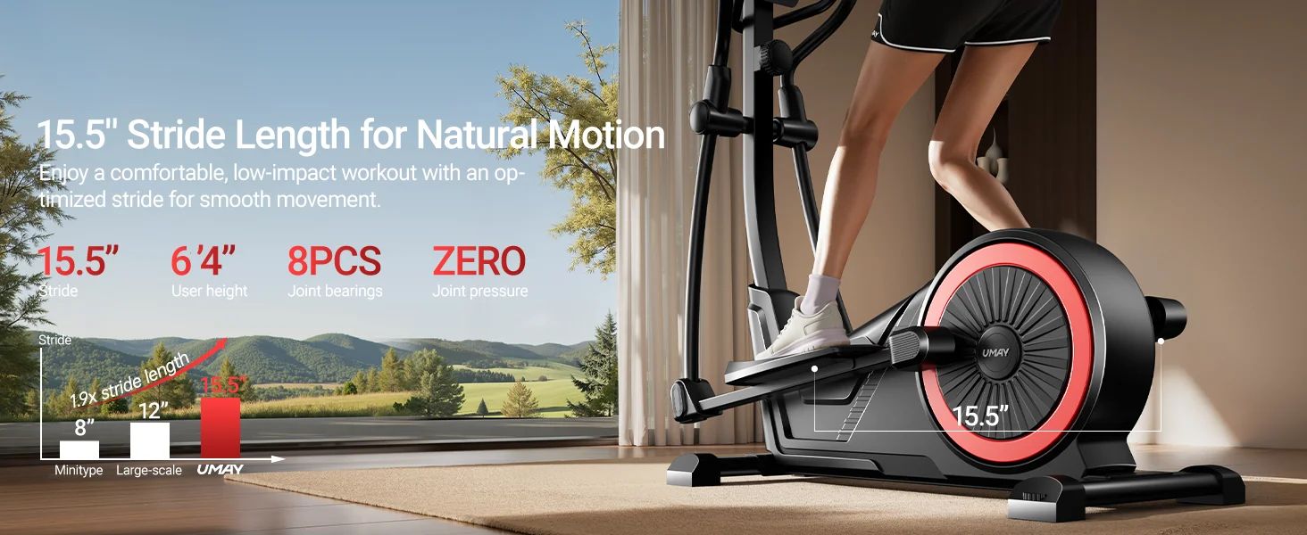 Optimal Stride Length:Experience the joy of natural, fluid movement with our elliptical machine's 15.5-inch optimal stride length. This carefully calibrated stride mimics the body's natural gait, providing a low-impact, joint-friendly cardio workout that's easy on your knees and hips. The textured, anti-slip pedals offer a secure and comfortable footing, ensuring stability and confidence during every workout, regardless of your fitness level or experience