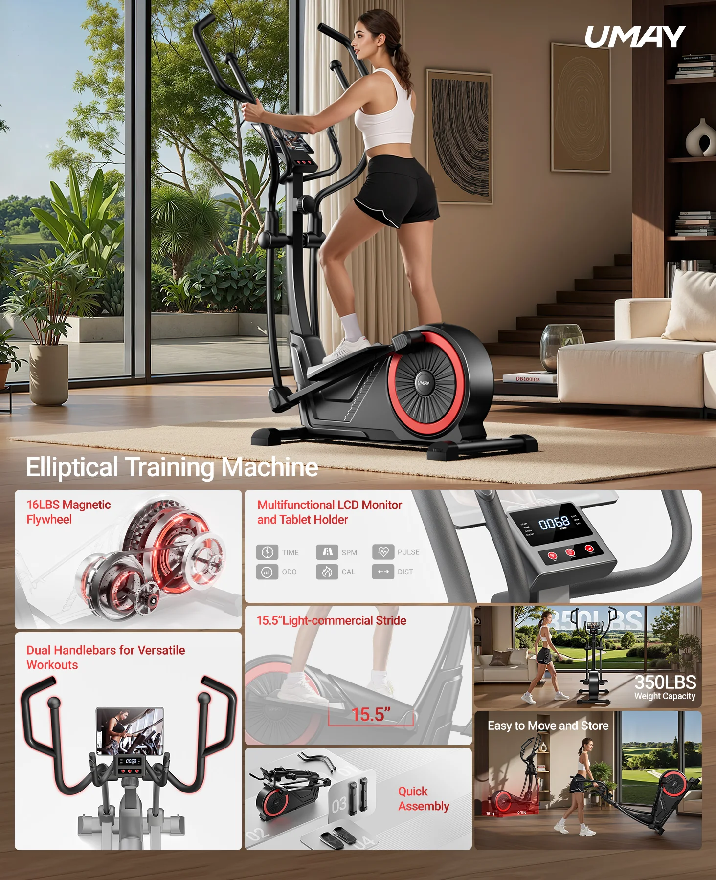 Sturdy and Durable Construction: Designed to withstand heavy use, our elliptical machine has a robust build with a weight capacity of 350 pounds. You can exercise with confidence, knowing that this machine is built to last. Invest in our Home Elliptical Machine today and take the first step towards a healthier, fitter you. With its advanced features and user - friendly design, it's the ultimate addition to your home gym