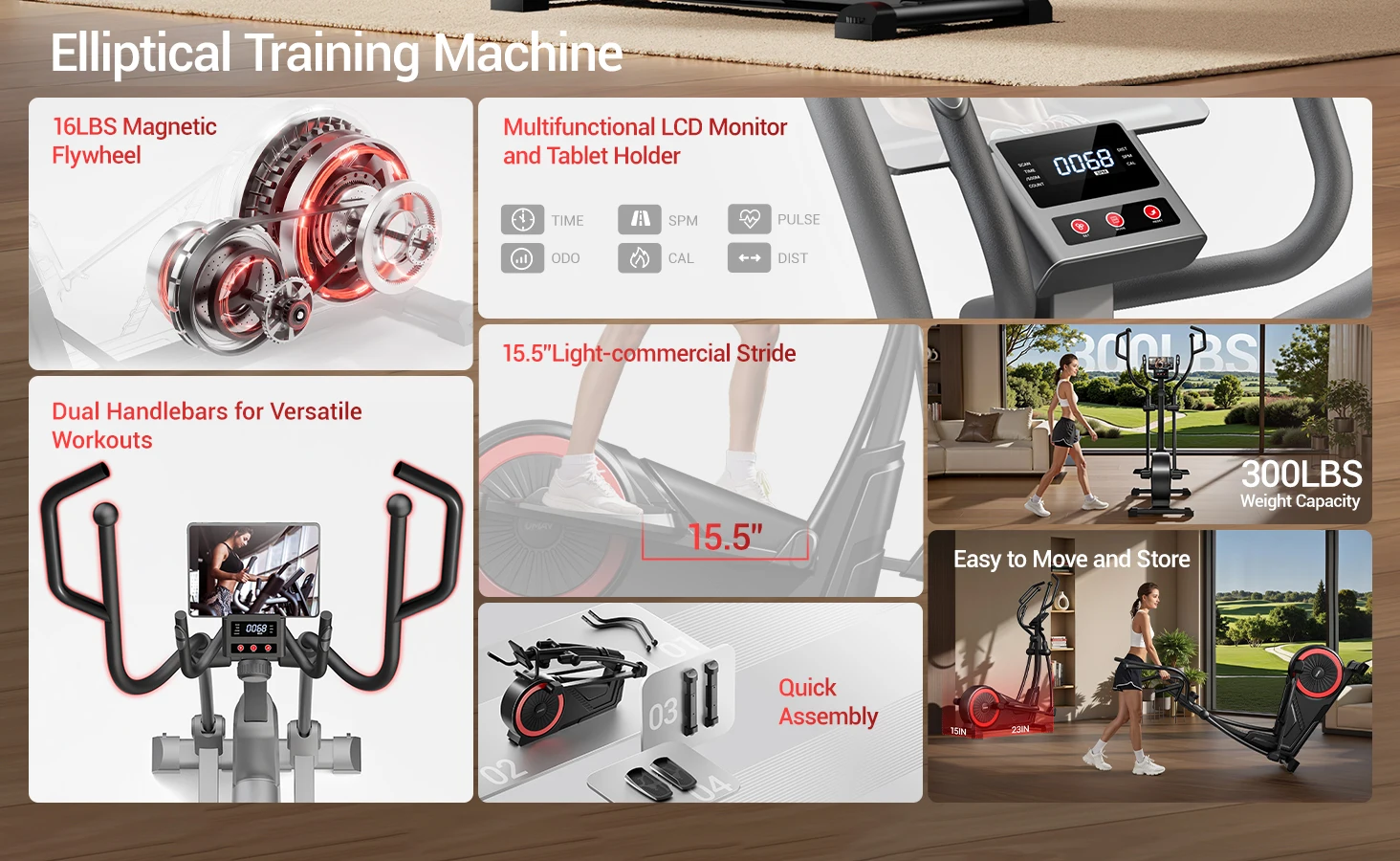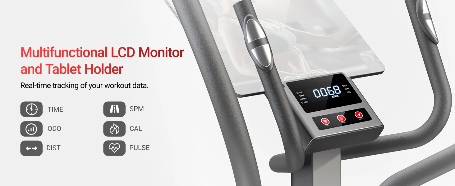 Real-Time Fitness Monitoring: The built-in digital with our elliptical machine monitor provides instant access to essential workout data, including time, speed, distance, calories burned, and pulse rate. This comprehensive feedback allows you to set goals, monitor your progress, and adjust your workout intensity to maximize results. With all the information you need at your fingertips, you'll stay motivated and on track to achieve your fitness goals