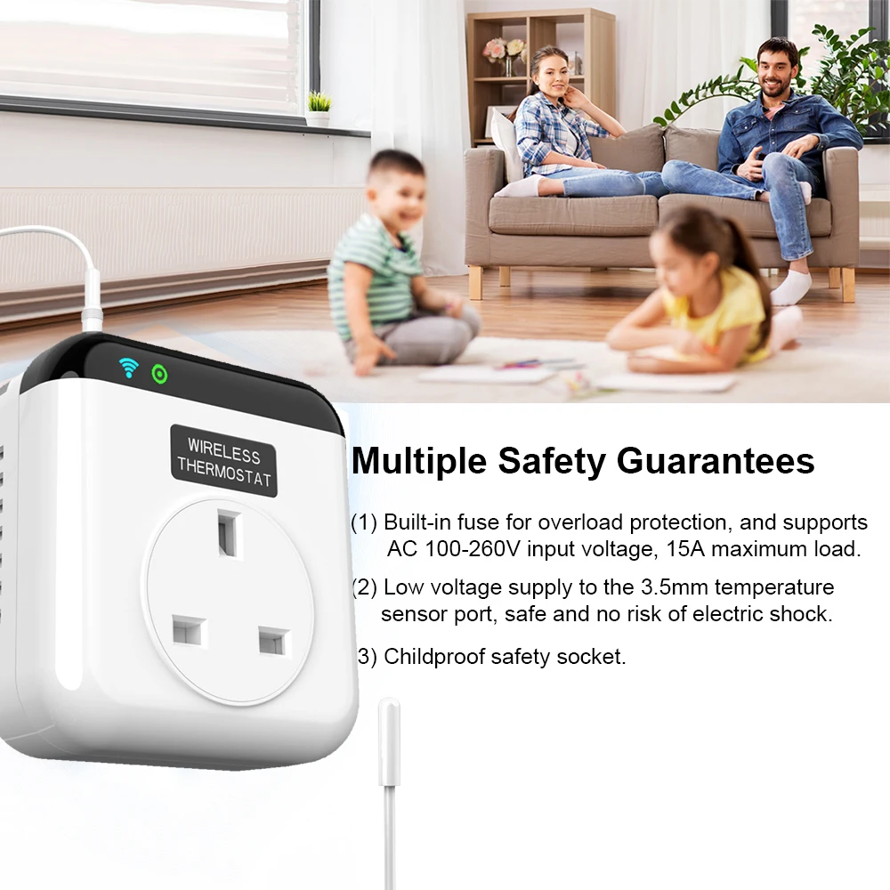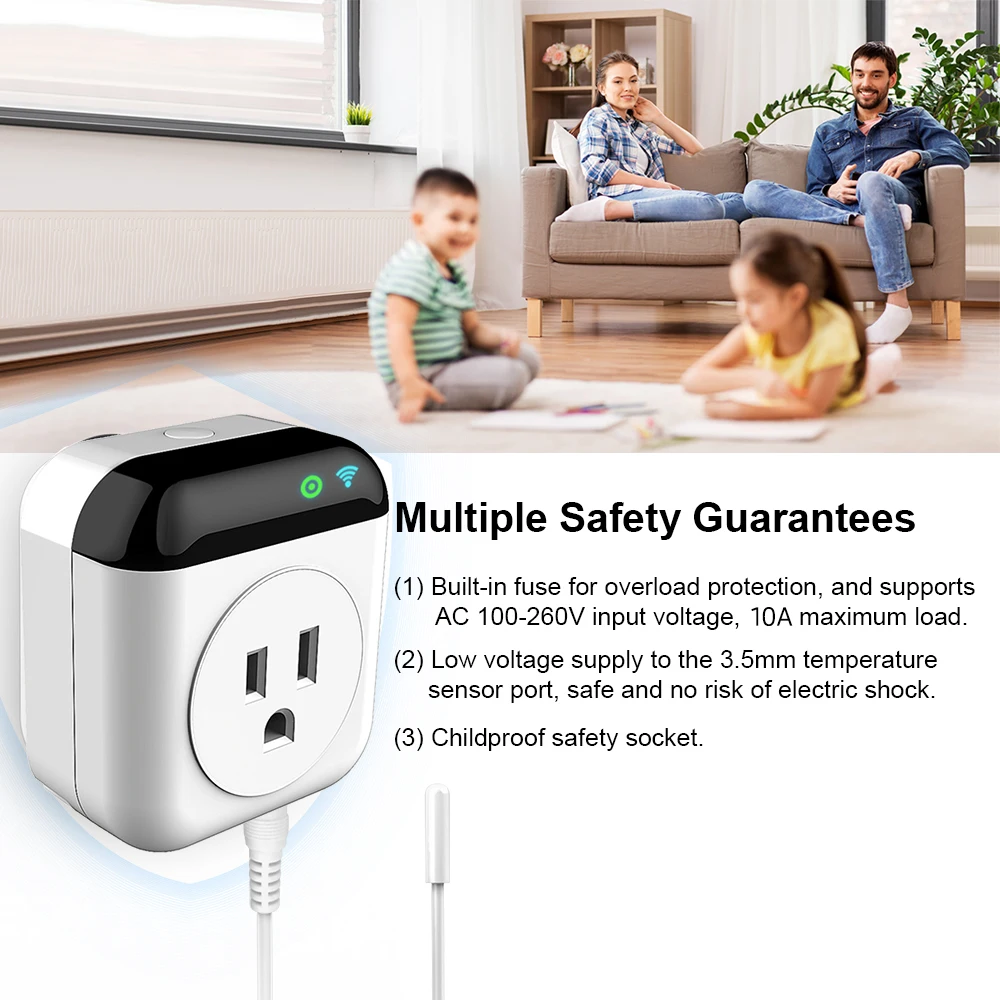 Multiple Safety Guarantees: (1) Built-in fuse for overload protection, and supports AC 100-260V input voltage, 10A maximum load. (2) Low voltage supply to the 3.5mm temperature sensor port, safe and no risk of electric shock. (3) Childproof safety socket.