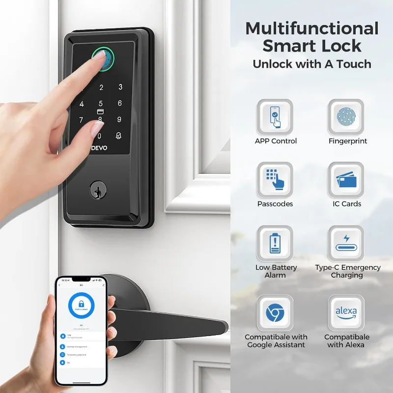 - 【Easy Installation & Support】Install this BHMA Certified smart lock on most standard US doors in just 15 minutes-no drilling needed. Compatible with most American standard doors (check before purchase). DEVO provides top-notch and technical support. Contact us for any questions or assistance.
